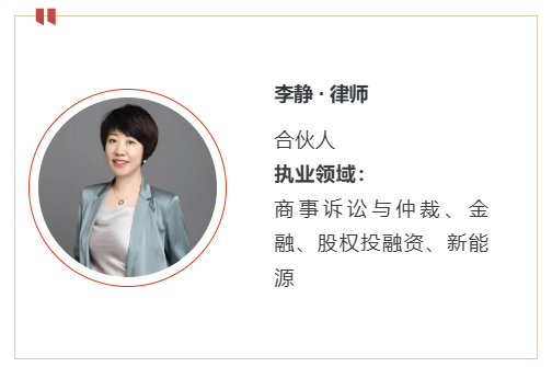 李静律师执业16年,熟悉商事诉讼与仲裁、金融、股权投融资、银行、证券服务、金融资管、新能源等领域法律服务。服务多家上市公司、新能源公司、银行、证券公司、公募基金公司、资产管理公司、保险资管公司,提供争议解决、咨询服务及并购业务。曾参与银行贷款项目法律评审工作,为大量企业提供上市挂牌融资、股权融资等法律服务,并多年服务于国电投、山高新能源等新能源领域电站业的投资并购和争议解决等。在大量案件中为基金及信托公司、信托投资者成功胜诉、挽回损失数亿元。凭借相关领域的卓越业绩,荣获国际知名机构商法、律新社大奖。